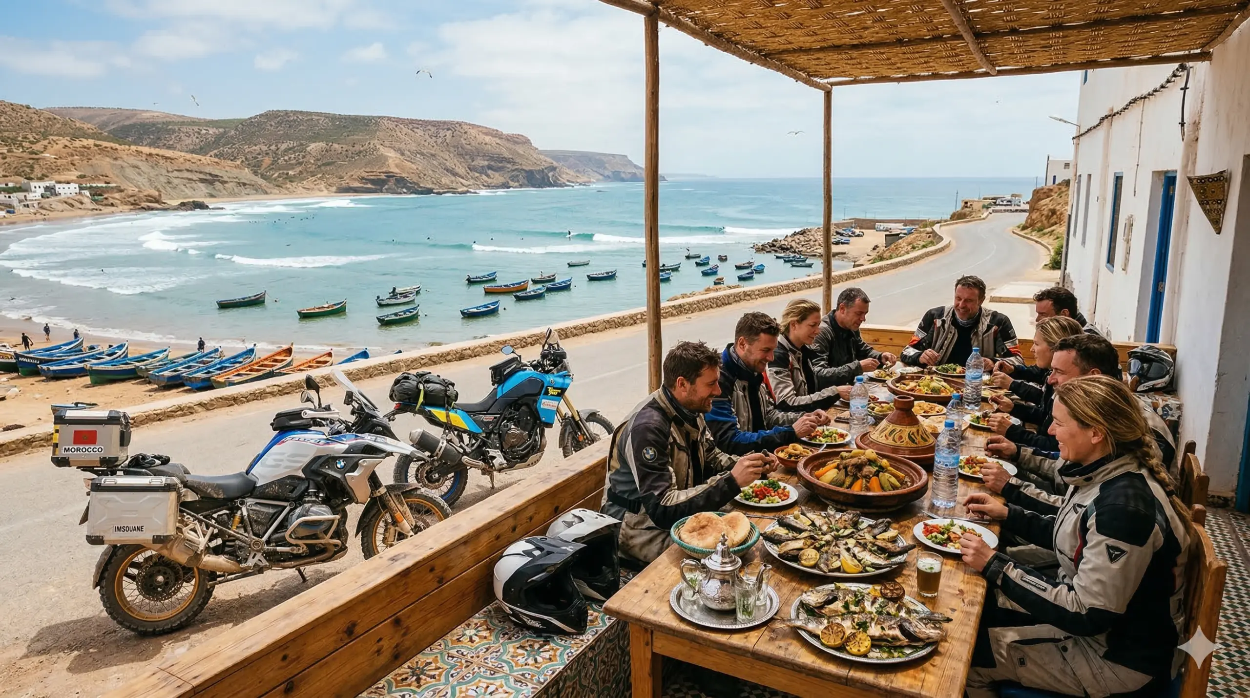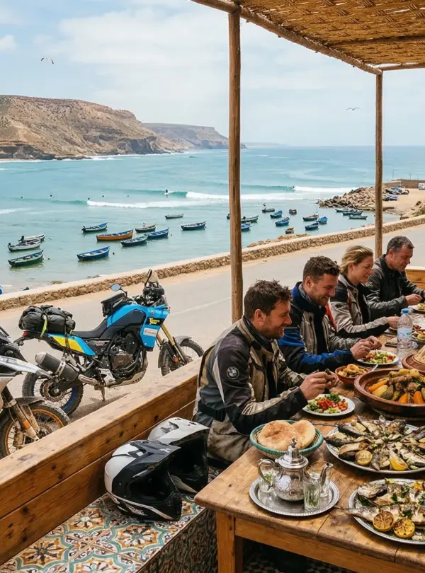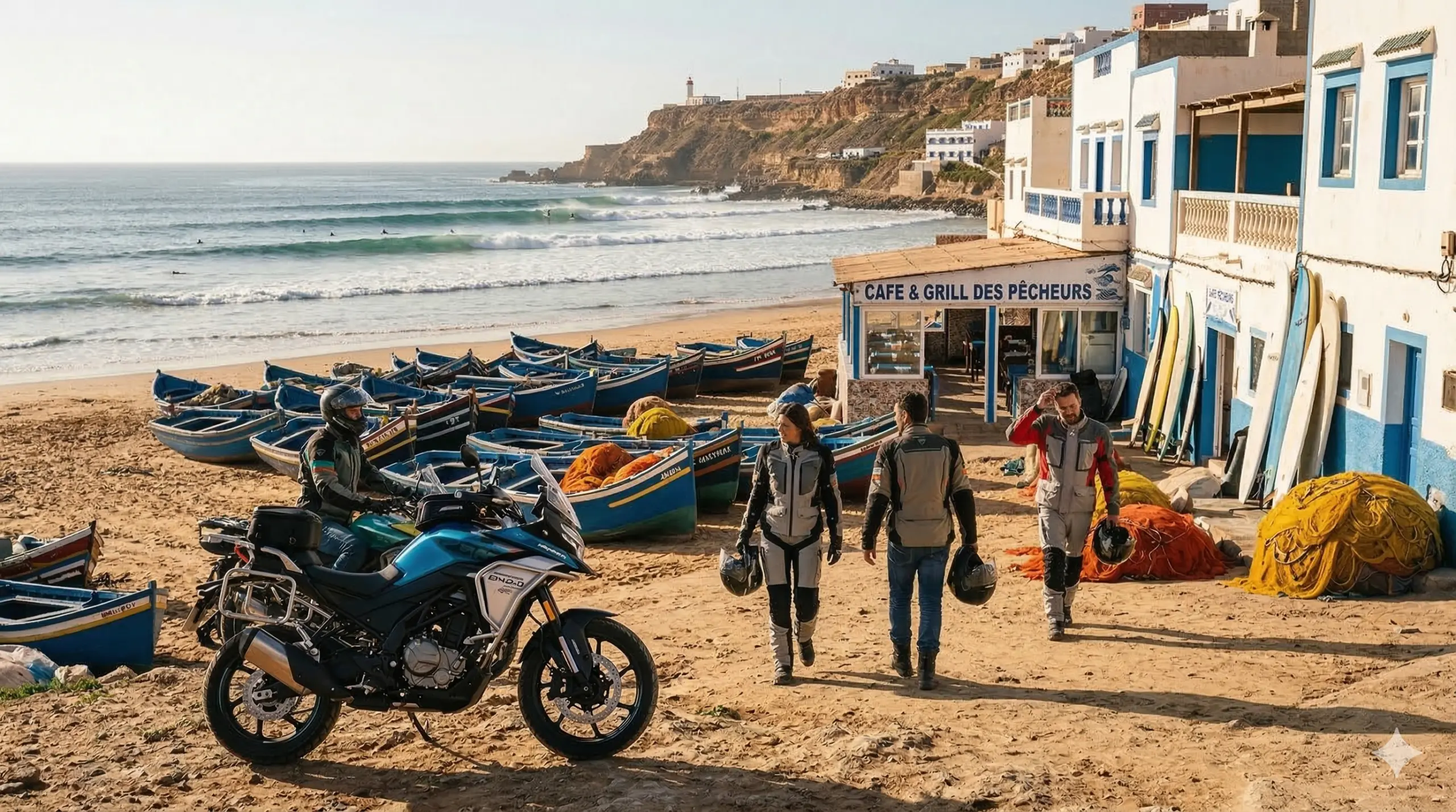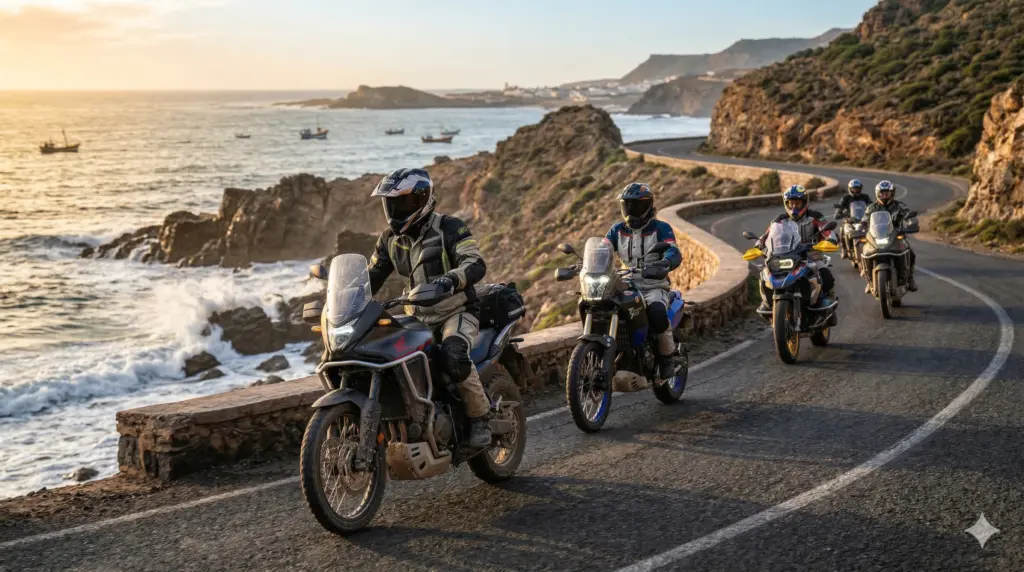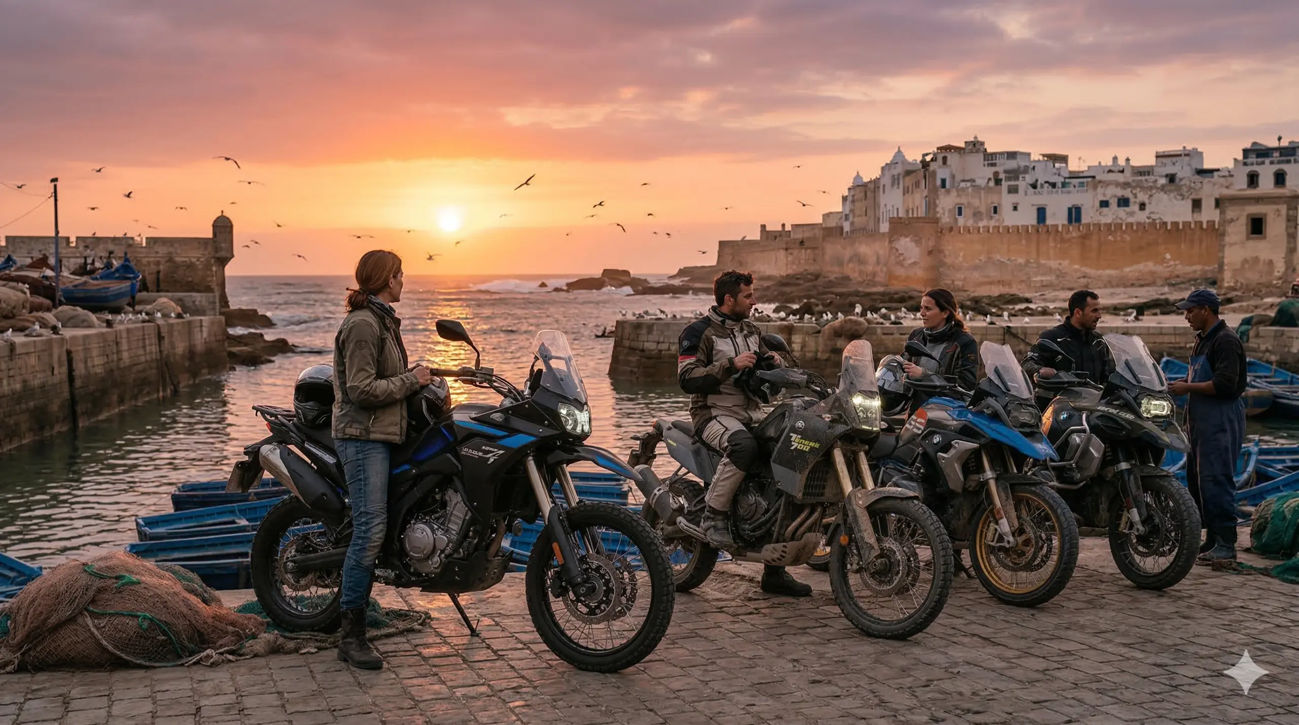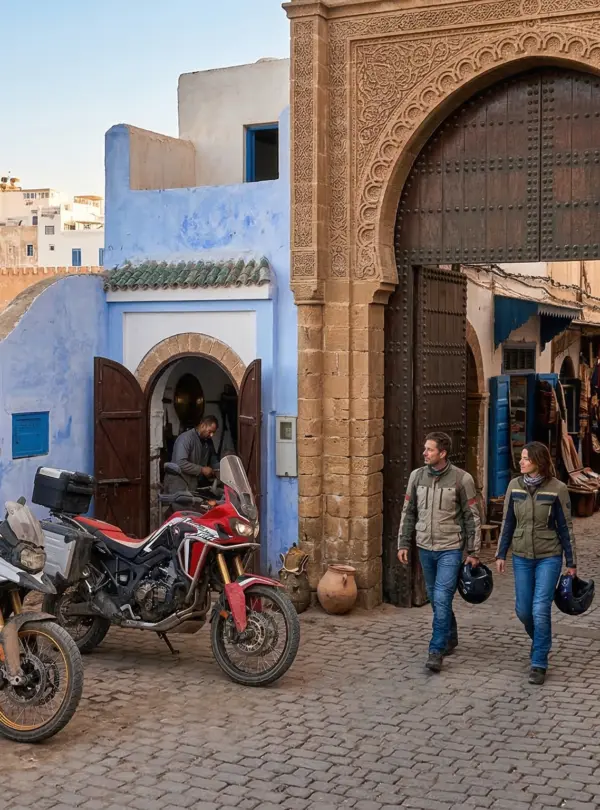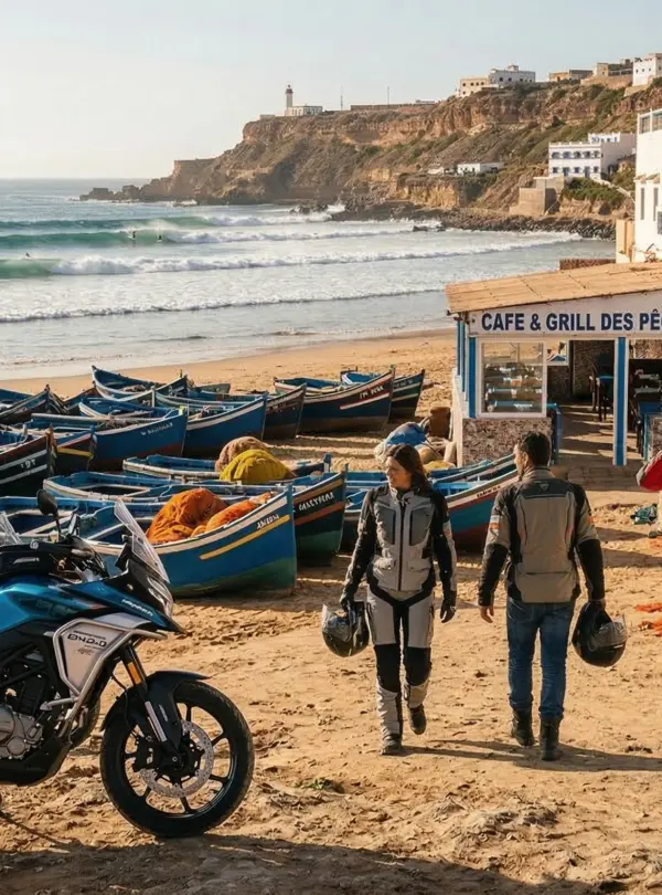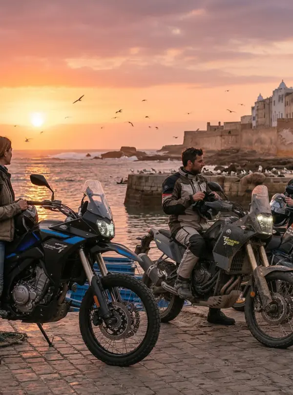 Experience the stunning Atlantic coastline on this 2-day morocco motorbike tours adventure from Agadir to Essaouira. This guided moto tours morocco coastal journey follows scenic ocean roads through Imsouane fishing village and surf culture hotspots. Perfect for riders seeking a relaxed morocco motorcycle trip with ocean views, fresh seafood, and authentic coastal charm. Ride premium adventure bikes (Honda Transalp, CF MOTO, VOGE) on this compact essaouira motorcycle tour with well-planned routes suitable for all levels. A perfect introduction to coastal riding on your morocco motorbike adventure.