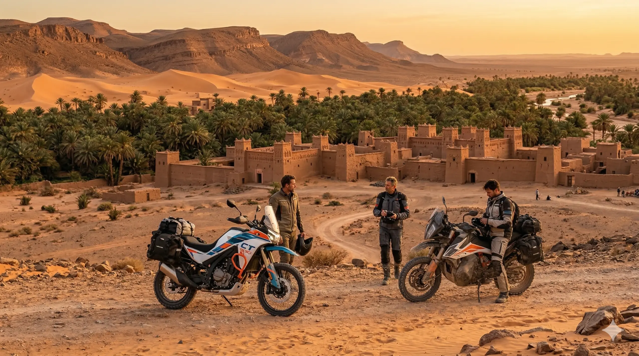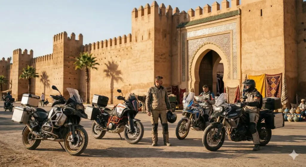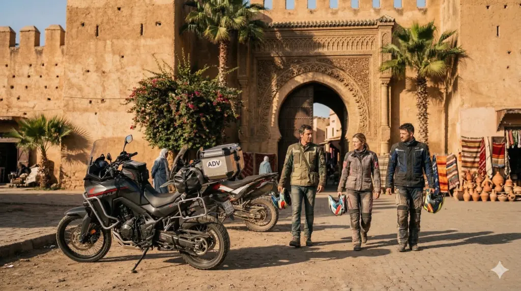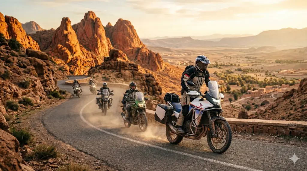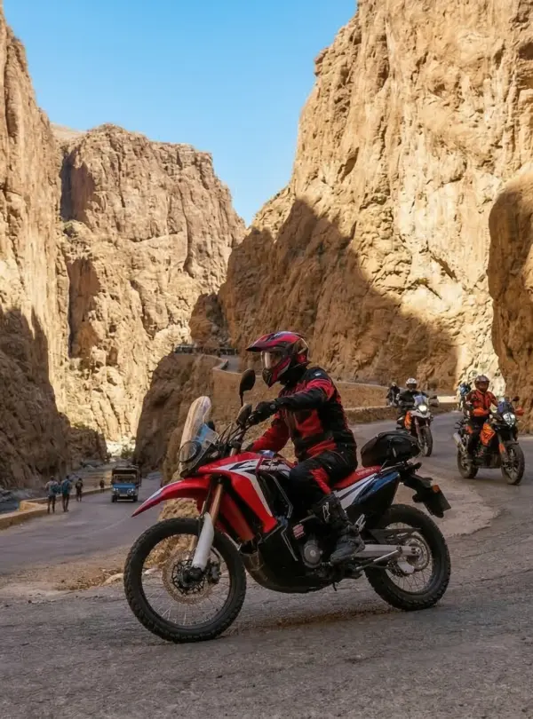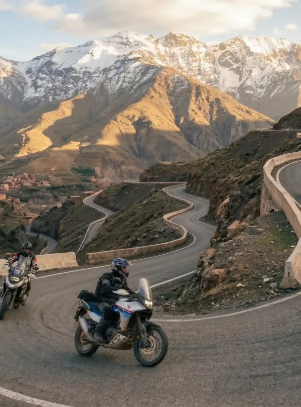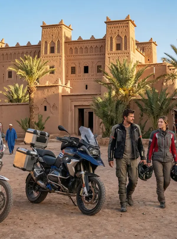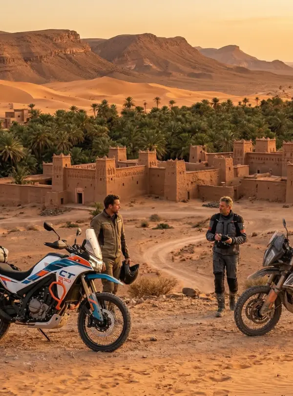 Embark on an epic 5-day morocco motorbike tours adventure from Marrakech through the High Atlas mountains and into the Sahara Desert. This guided moto tours morocco experience crosses the legendary Tizi n’Tichka pass, explores the Dades Valley and Todra Gorges, and reaches the desert gateway of Zagora. Perfect for riders seeking an authentic morocco motorcycle trip with dramatic mountain scenery, oasis landscapes, and traditional Berber villages. Ride premium adventure bikes (Honda Transalp, CF MOTO, VOGE) on this comprehensive morocco off road motorcycle tours itinerary with optional 10% off-road sections. A true desert motorcycle adventure from marrakech moto base.