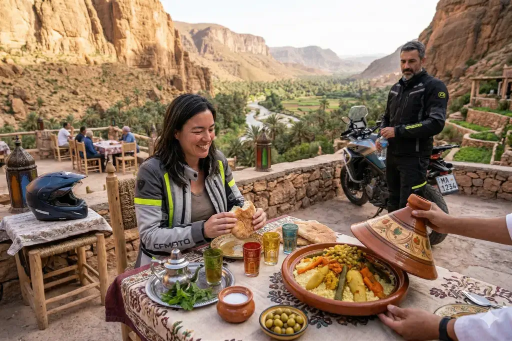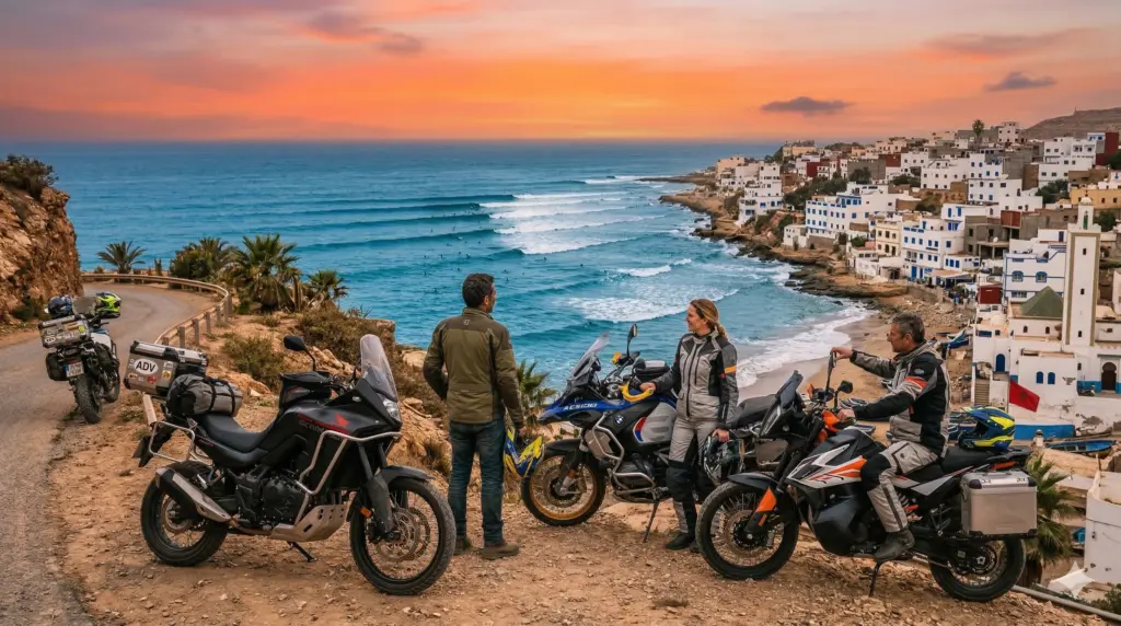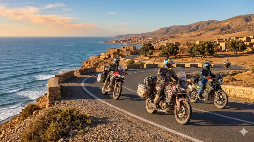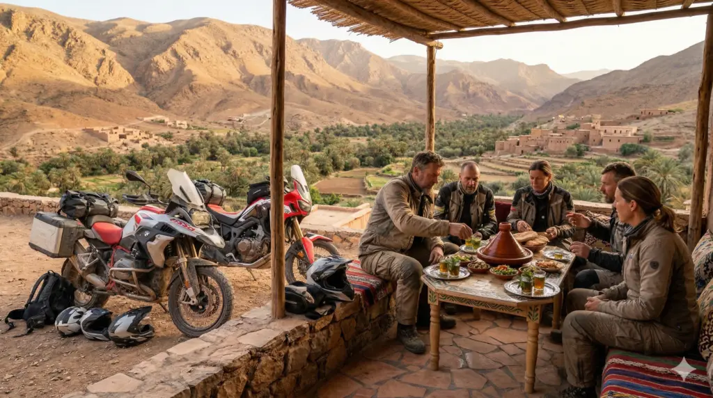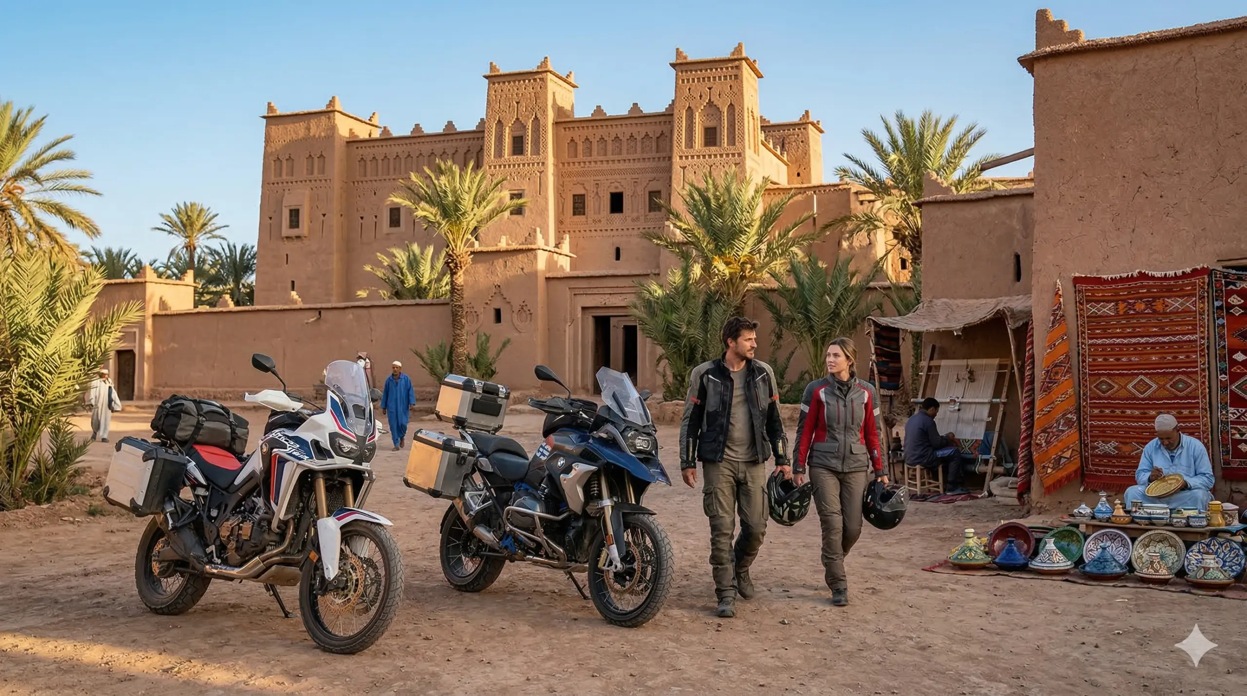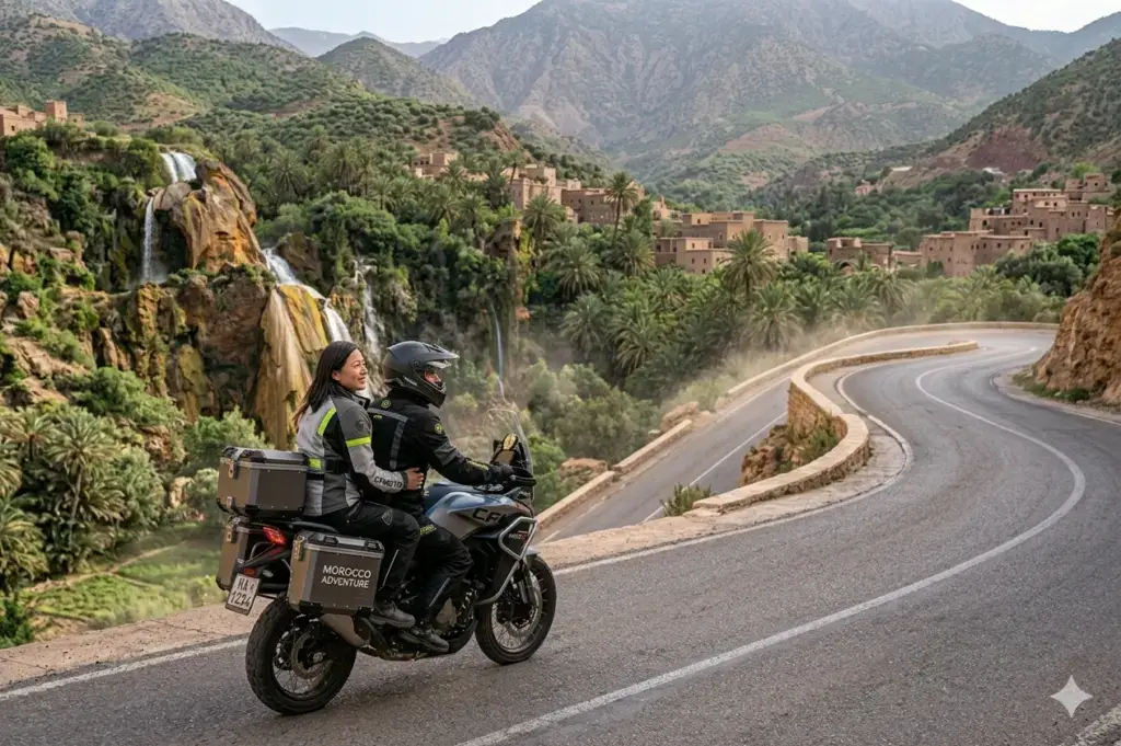 Embark on an epic 5-day morocco motorbike tours adventure from Marrakech through the High Atlas mountains and into the Sahara Desert. This guided moto tours morocco experience crosses the legendary Tizi n’Tichka pass, explores the Dades Valley and Todra Gorges, and reaches the desert gateway of Zagora. Perfect for riders seeking an authentic morocco motorcycle trip with dramatic mountain scenery, oasis landscapes, and traditional Berber villages. Ride premium adventure bikes (Honda Transalp, CF MOTO, VOGE) on this comprehensive morocco off road motorcycle tours itinerary with optional 10% off-road sections. A true desert motorcycle adventure from marrakech moto base.