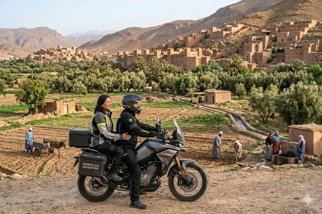 Discover the charming mountain village of Imouzzer as a passenger on this 4-hour scenic motorcycle tour from Agadir. No riding experience needed — enjoy winding mountain roads, lush green landscapes, waterfalls, and traditional Berber hospitality from the comfort of a CFMOTO 450MT with our professional pilot. Includes traditional lunch with mountain and cascade views. Perfect for nature-loving passengers seeking mountain village adventure.
