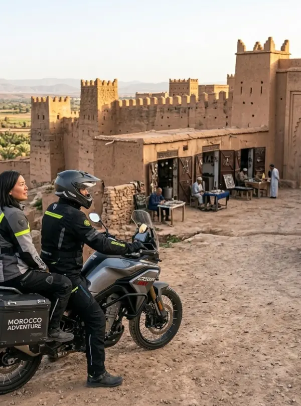 Explore the “Little Marrakech” of Taroudant as a passenger on this 5-hour cultural motorcycle tour from Agadir. No riding experience needed — discover impressive city walls, traditional souks, and authentic Moroccan atmosphere from the comfort of a CFMOTO 450MT with our professional pilot. Includes traditional lunch overlooking the medina. Perfect for culture-loving passengers seeking historic adventure.